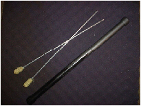Fire Eating Torches – These torches are constructed from ¼" diameter aluminum rod with a 1.75" long torch head. The rod is threaded under the wicking to keep it from sliding, while the rest of the rod is smooth. Being aluminum, the rods won’t rust nor will they heat up quickly. The kevlar wicking does not have wire in it. The overall length of these torches is 18". The cost, including carrying case, is $25. If you wish only the torches, they can be purchased at $10 a piece.