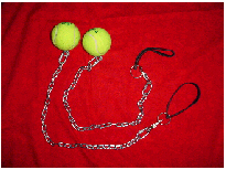 Practice Poi – 18" welded chain with two screw lockdown link connectors create the long chain while a swivel clip, folded 9" of a leather strip, two grommets and a screw down link. Overall length from end of strap to the tennis ball is 27". A tennis ball with steel connectors, a washer inside with a nut superglued to the bolt make sure that the ball will not come free. They are sold in sets of 2. Overall cost is $25.