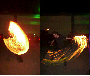 Fire Eating Torches – These torches are constructed from ¼" diameter aluminum rod with a 1.75" long torch head. The rod is threaded under the wicking to keep it from sliding, while the rest of the rod is smooth. Being aluminum, the rods won’t rust nor will they heat up quickly. The kevlar wicking does not have wire in it. The overall length of these torches is 18". The cost, including carrying case, is $25. If you wish only the torches, they can be purchased at $10 a piece.