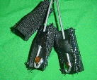 Fire Sword – Sorry that is it all black. It has been used quite a bit. The 34" sword is a hard wood practice sword that has been wrapped in aluminum tape (I have used it in over a dozen performances and although from time to time I can smell the wood, there has been no degradation of the piece in any way). Wire reinforced wicking extends along one edge from the tip to 4" above the crossguard. The wicking is secured via framing wire that wraps around the backside of the blade. The crossguard is made of aluminum to keep the heat at bay. Note! This is a very dangerous device to use as the flames can easily glide up the sword to your arm in any number of movements. I have lost the hair of my forearm quite a few times due to this piece. The cost of this piece is $75 – due to the quality of the parts used.